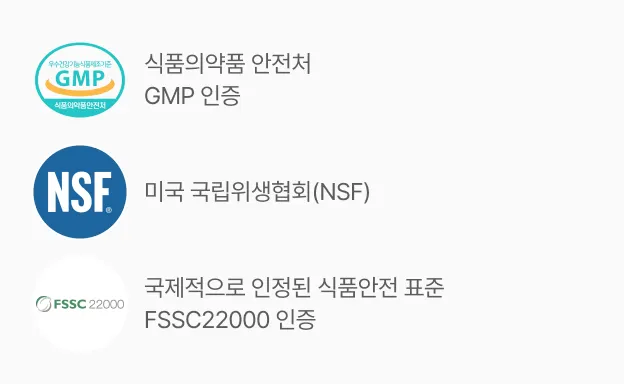 제조원인 코스맥스엔비티(주)는 풍부한 공정 노하우와 철저한 품질시스템으로 동종업계 최초 미국 국립위생협회(NSF)의 인증을 획득 하는 등 각종 국내외 품질 인증을 획득, 국내외 300개 이상 고객사를 보유한 글로벌 건강기능식품 ODM 업체입니다.