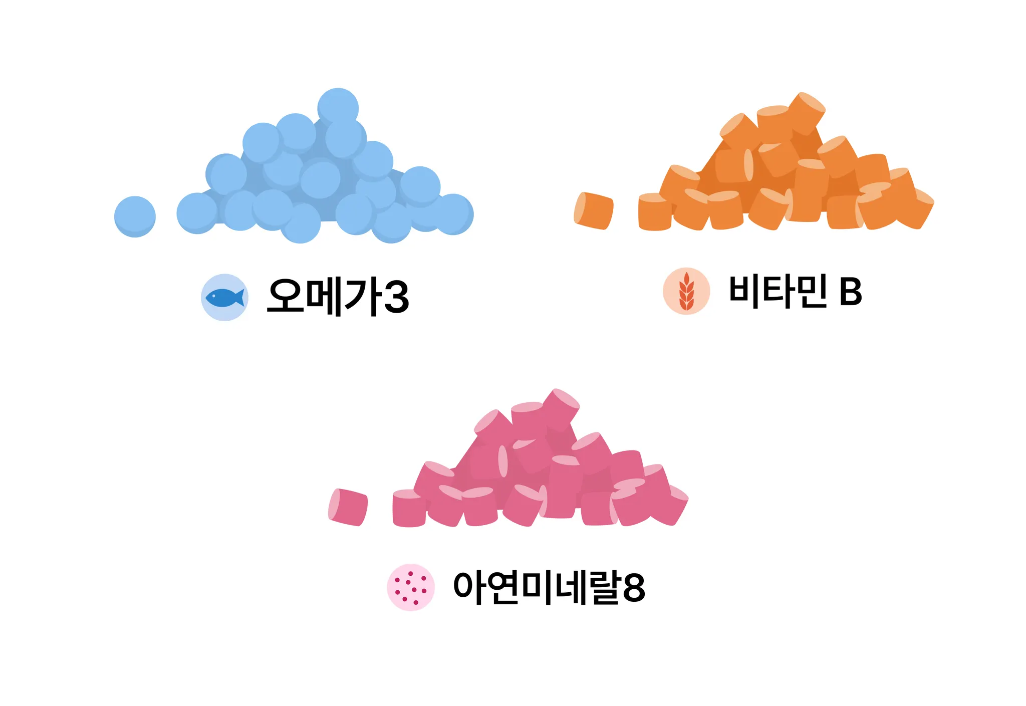 소화불량이나 속쓰림이 있으신 경우, 위장에 부담을 줄 수도 있는 오메가3, 비타민 B, 아연미네랄8을 감량해 드려요. 위장이 불편한 동안에는 위 영양성분들을 잠깐 줄여서 드신 후, 증상이 사라진 뒤 다시 증량하는 것이 좋아요.