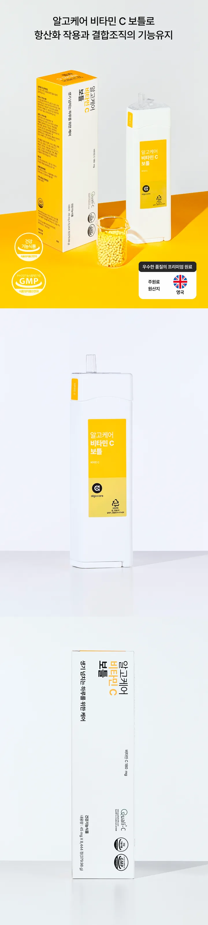 알고케어 비타민 C 보틀은 세계 최대 원료사인 DSM社의 영국산 프리미엄 비타민 C를 원료로 사용하였습니다. 영국은 서양권에서 유일*한 비타민 C 생산지입니다.