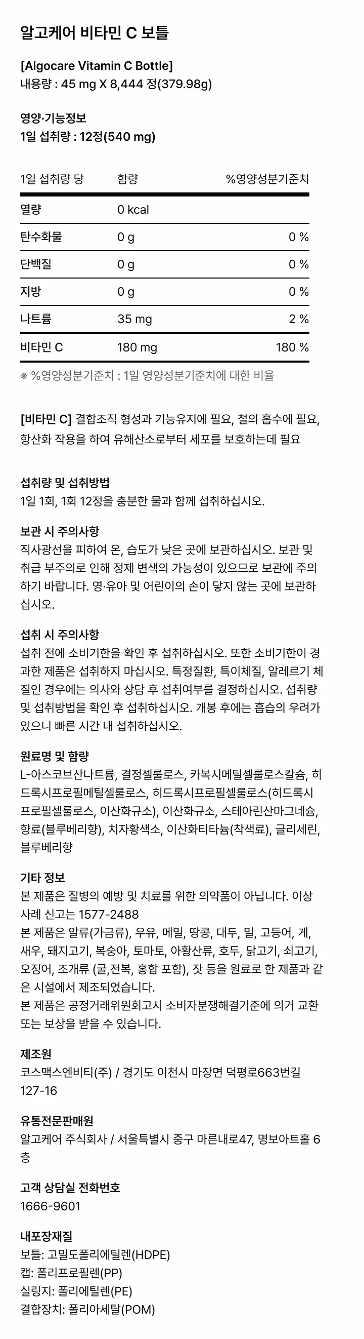 알고케어 비타민 C 보틀은 GMP 인증시설에서 엄격한 품질 관리 및 인증 시스템 하에 안전하고 위생적으로 제조되며, 식약처 지정 기관과 제조원의 품질검사를 거쳐 판매됩니다.