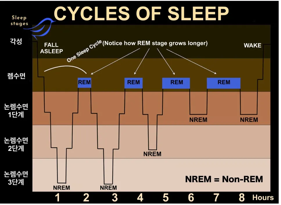 수면은 총 4가지 단계(비렘수면 1단계-비렘수면 2단계-비렘수면 3단계-렘수면)로 이루어져요. 수면의 4단계는 수면 주기 한 사이클을 형성하며, 한 사이클은 약 90분으로 이루어집니다.