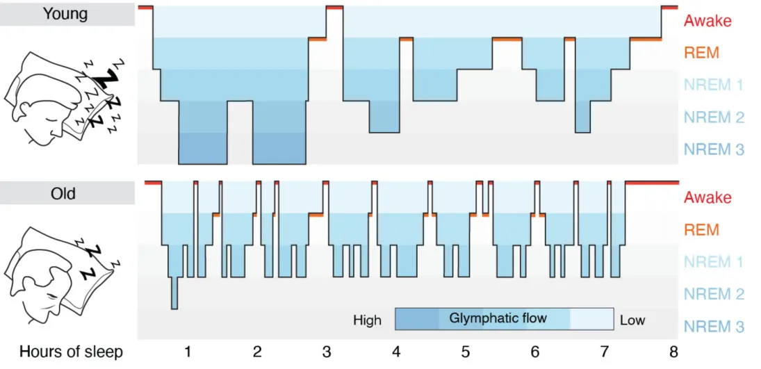 수면의 구조와 수면 단계별 글림프 흐름을 보여주는 그래프에요(청록색이 짙을수록 글림프 시스템이 잘 작동함을 의미함).젊은이는 잠이 들면 곧 논렘수면 3단계(깊은 수면)에 이르고 뇌척수액이 잘 흐르는 경향을 보여요(위). 반면, 노인은 잠이 들어도 논렘수면 3단계에 이르지 못하고 자주 깨는 사이클을 보여요. 그 결과 뇌척수액의 흐름도 원활하지 못해 뇌에 노폐물이 점점 쌓이게 돼요.
