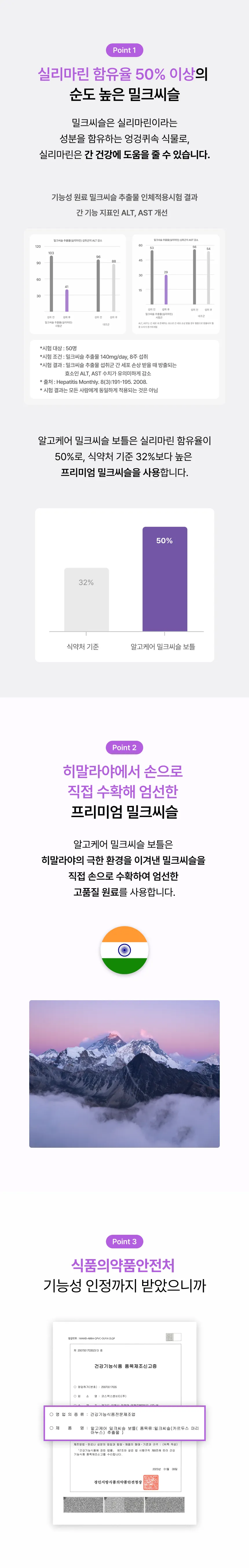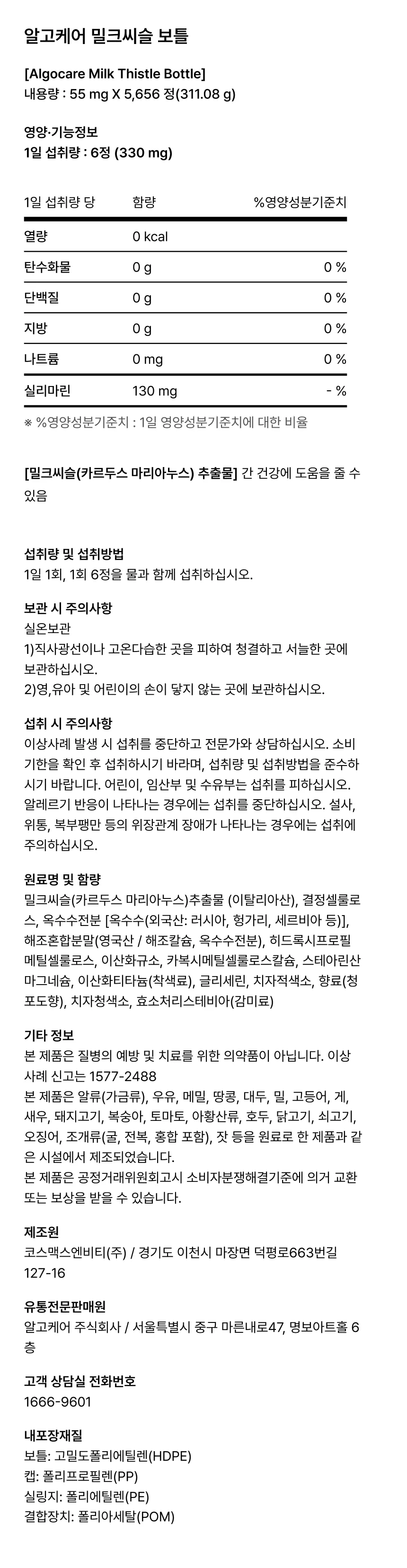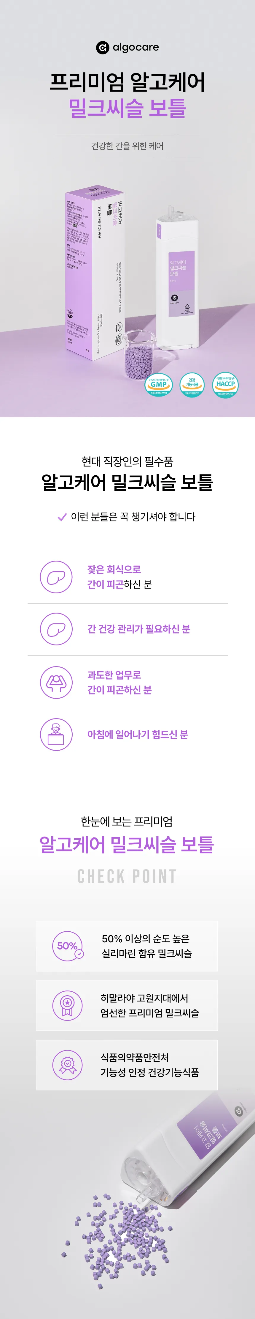 알고케어 밀크씨슬 보틀은 GMP 인증시설에서 엄격한 품질 관리 및 인증 시스템 하에 안전하고 위생적으로 제조되며, 식약처 지정 기관과 제조원의 품질검사를 거쳐 판매됩니다.