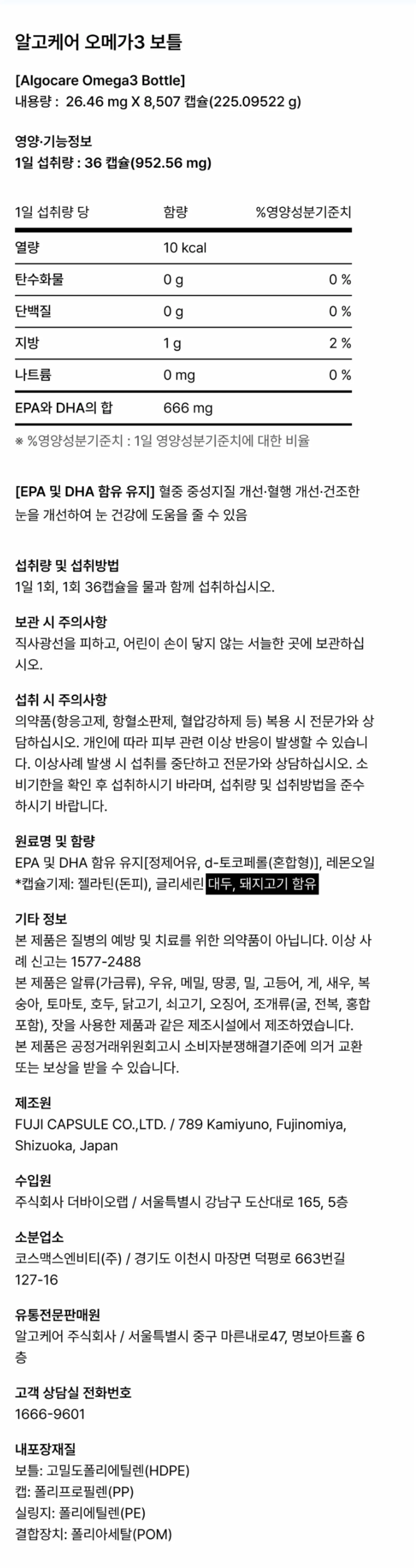 알고케어 오메가3 보틀은 국제적으로 공인된 미국 국립위생협회(NSF)의 인증을 받은 후지캡슐에서 엄격한 품질관리 및 인증 시스템하에 안전하고 위생적으로 제조됩니다.