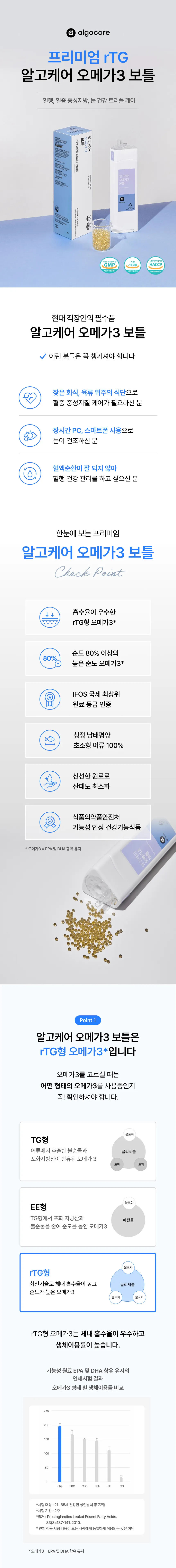 오메가3는 우리 몸에서 충분히 합성되지 않는 불포화지방산이며, 원활한 신진대사와 기능 유지를 위해 생체 내에서 반드시 필요합니다. 특히 EPA와 DHA는 혈중 중성지질 개선 · 혈행 개선 · 기억력 개선 · 건조한 눈을 개선하여 눈 건강에 도움을 줄 수 있습니다.