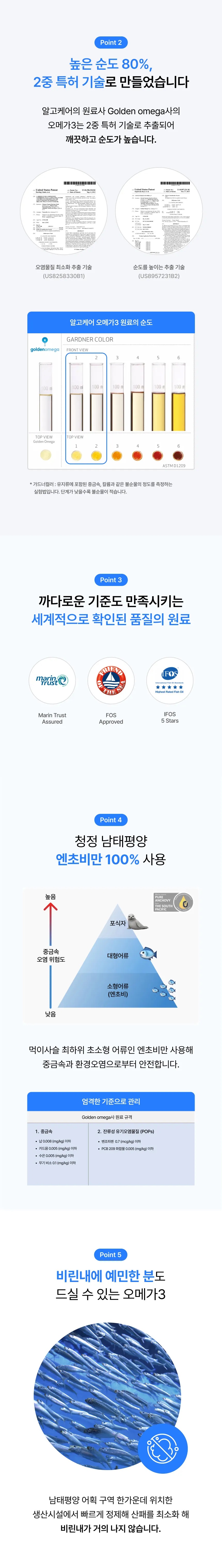 Golden omega사의 오메가3 원료는 가드너컬러* 레벨 2 이하로 깨끗하게 관리되며 EPA와 DHA의 합이 80%인 높은 순도를 가지고 있습니다.