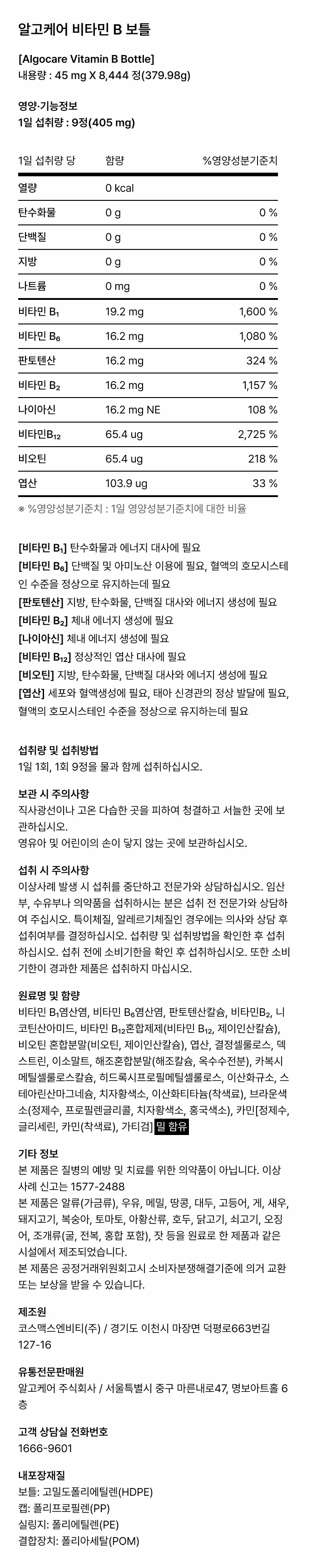 알고케어 비타민 B 보틀은 GMP 인증시설에서 엄격한 품질 관리 및 인증 시스템 하에 안전하고 위생적으로 제조되며, 식약처 지정 기관과 제조원의 품질검사를 거쳐 판매됩니다.
