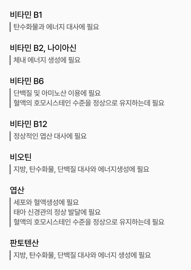 비타민 B군은 체내 에너지 생성에 필수적인 역할을 하는 영양소로 정상적인 성장, 발달 및 건강유지에 필요합니다.