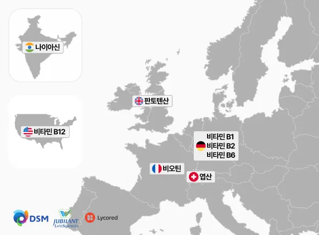 비타민 B1, B2, B6, 판토텐산, 비오틴, 엽산은 유럽 DSM社의 원료를 사용합니다. DSM社는 120여 년 전통의 세계 최대의 프리미엄 비타민 원료 제조업체입니다. 신뢰성과 안전성, 연구기술력을 보유한 기업입니다.