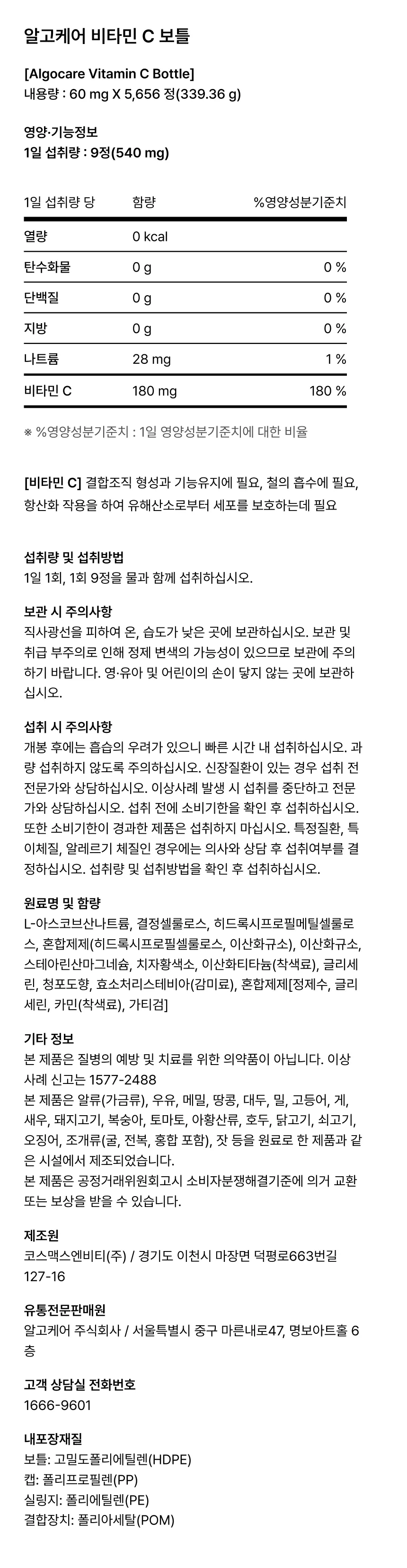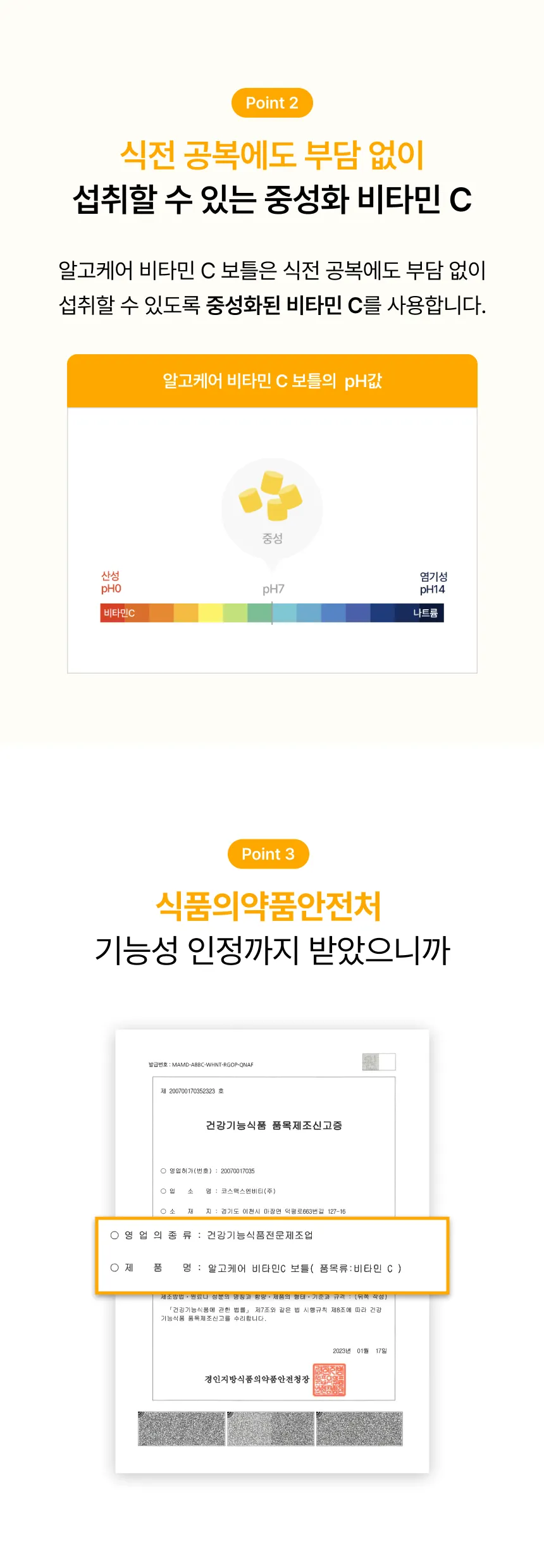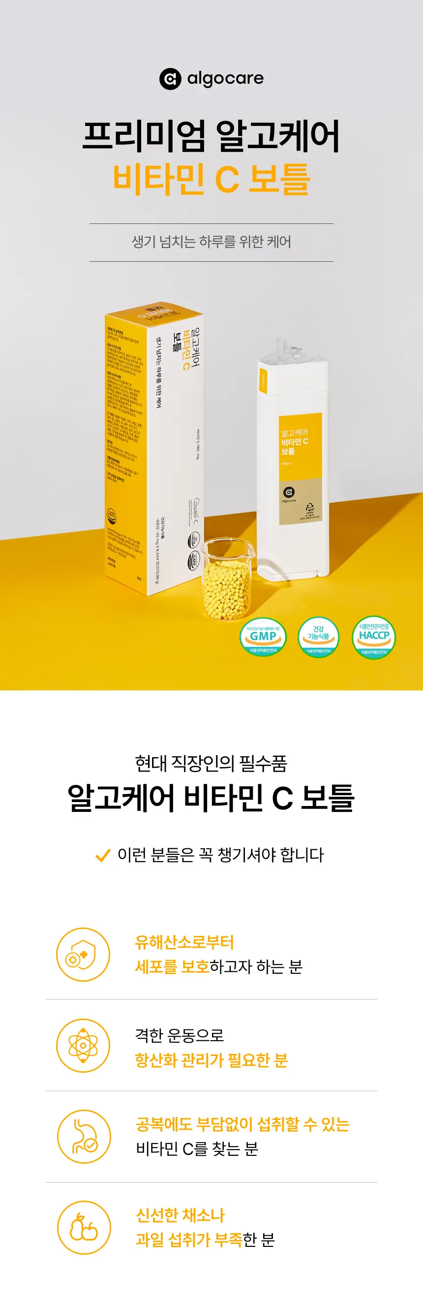 알고케어 비타민 C 보틀은 GMP 인증시설에서 엄격한 품질 관리 및 인증 시스템 하에 안전하고 위생적으로 제조되며, 식약처 지정 기관과 제조원의 품질검사를 거쳐 판매됩니다.