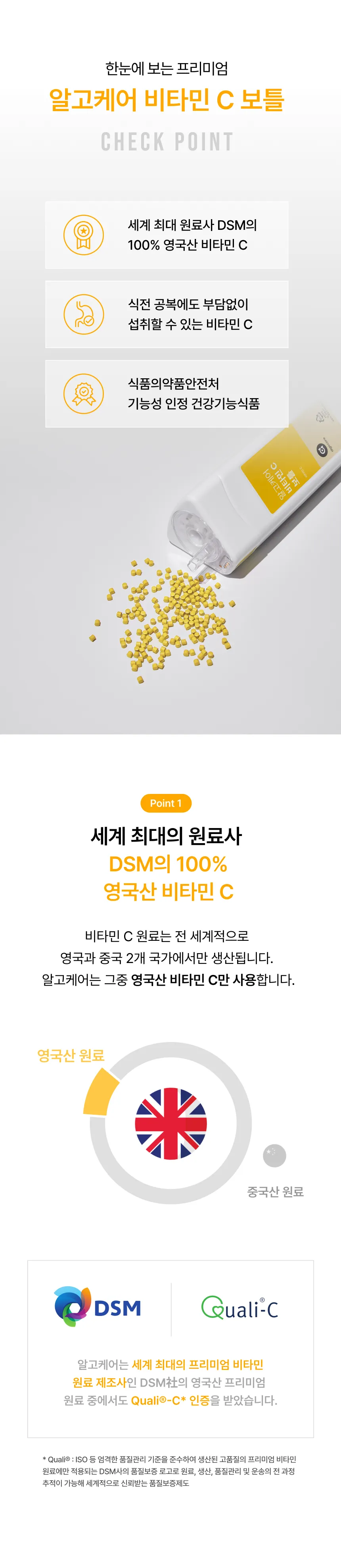 알고케어 비타민 C 보틀은 유럽에서 엄선된 DSM社의 영국산 프리미엄 원료를 사용합니다.