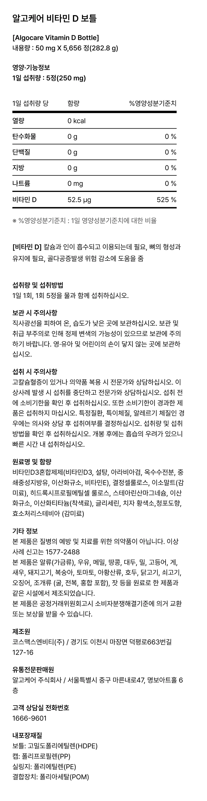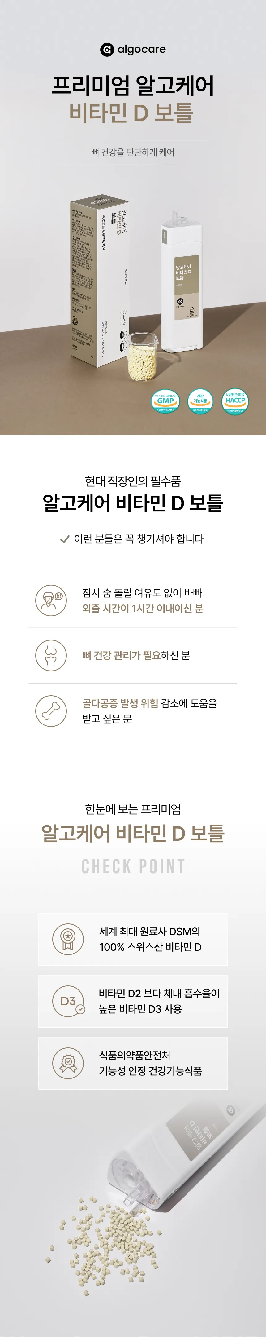 알고케어 비타민 D 보틀은 GMP 인증시설에서 엄격한 품질 관리 및 인증 시스템 하에 안전하고 위생적으로 제조되며, 식약처 지정 기관과 제조원의 품질검사를 거쳐 판매됩니다.