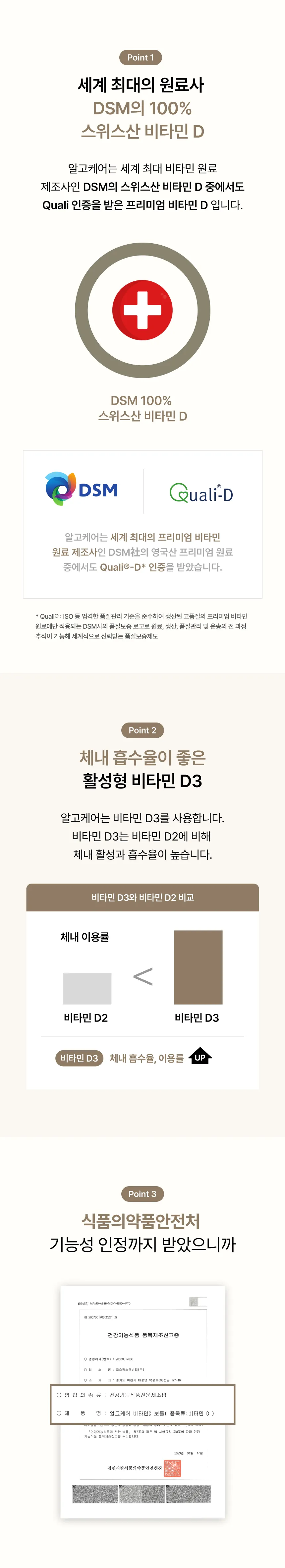 음식이나 보충용제품을 통해 섭취할 수 있는 비타민 D는 비타민 D2(에르고칼시페롤)와 비타민 D3(콜레칼시페롤)의 두 가지 형태가 있습니다. 비타민 D2는 식물성 식품에 함유되어 있으며, 비타민 D3는 피부가 자외선에 노출될 때 자연적으로 생성되거나 동물성 식품에 함유되어 있습니다. 비타민 D3가 D2보다 흡수가 좋고 활성이 높아서 효율적입니다.¹ 알고케어의 비타민 D 보틀은 흡수율이 좋은 비타민 D3를 사용합니다.