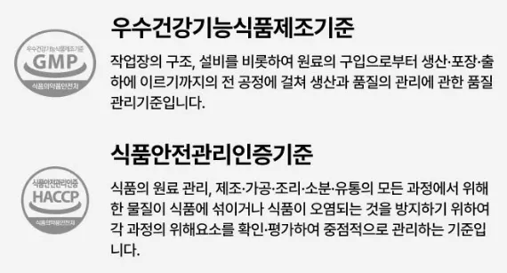 우수건강기능식품 제조기준을 인정받은 GMP 인증시설에서 엄격한 품질 관리 및 인증 시스템 하에 안전하고 위생적으로 제조되며, 식약처 지정 제3기관과 제조원의 엄격한 품질검사를 거쳐 판매됩니다. 또한 식품안전관리인증기준(HACCP) 인증을 받았어요.