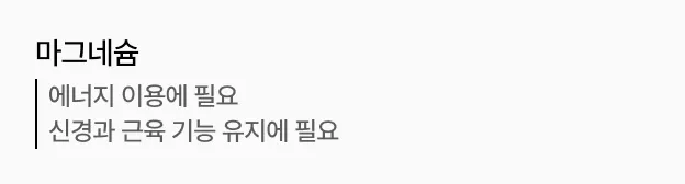 마그네슘은 신경 자극 전달, 근육의 수축 및 이완에 관여하므로 신경과 근육의 정상적인 기능을 유지하는 데 필요합니다.또한 탄수화물의 에너지 대사에 필수적인 요소이며 인체 내 300종 이상의 효소 반응에서 조효소로 작용하는 등 각종 체내 에너지 대사에 관여합니다.