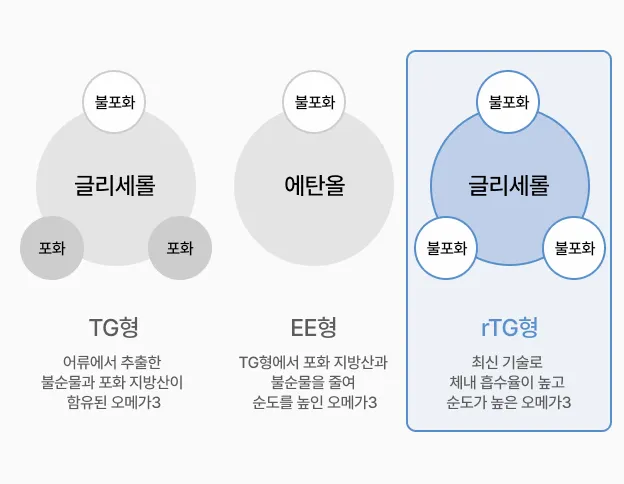 rTG형은 가장 최신 기술로, 포화지방산과 불순물을 제거하여 자연 형태와 가장 유사한 분자 구조를 가지며 체내 흡수율과 생체 이용률이 높습니다.