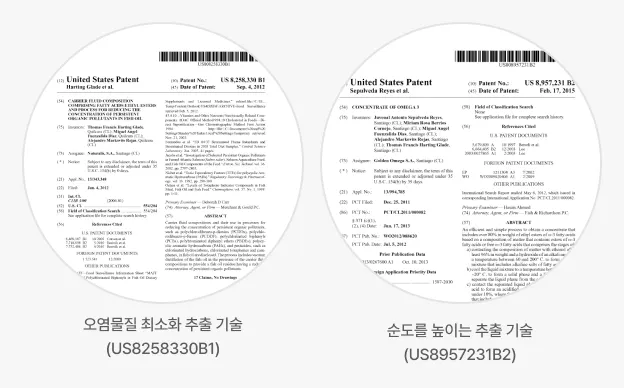 Golden omega사는 2종의 특허 받은 정제 기술로 추출하여 원료가 깨끗하고 순도가 높습니다. 오염물질 최소화 추출 기술(US8258330B1)은 어유 내 잔류성 유기 오염물질의 농도를 감소시키는 기술이며 순도를 높이는 추출 기술 (US8957231B2)은 80% 이상 순도를 얻기 위한 효율적인 공정입니다.